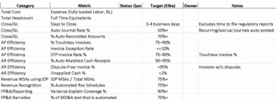 - Review current software stack. You want to understand what software the accounting & finance teams use, as well as what AI functions already exist, and what functions are on the product roadmap. Your software relationship managers are useful sources of this information. Share your aspirational metrics from the previous step with them. How many of these metrics can the software meet today or within the next three months? What you will likely find is that Enterprise Resource Planning (ERP) systems do not have a high degree of AI built in them, so you will need to add purpose-built software, which is the next step.